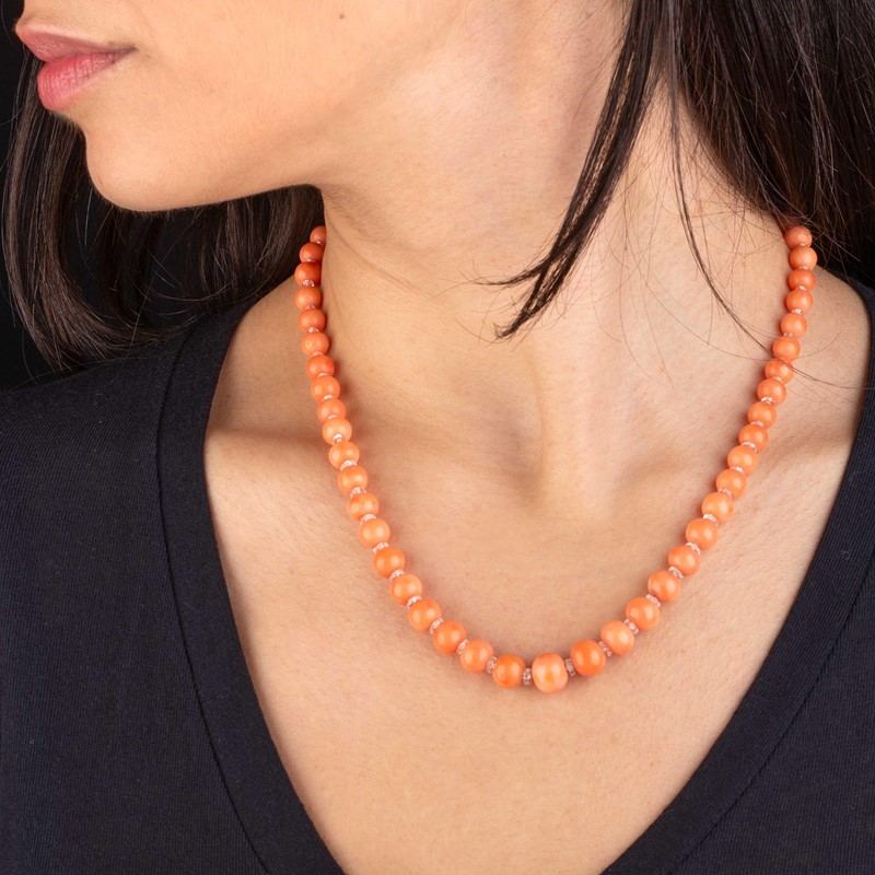 composta da una serie di sfere in corallo leggermente digradanti di mm 10-7 circa, alternate a piccoli elementi a disco in cristallo di rocca, fermatura in oro 9kt, lungh. cm 47, gr. 34