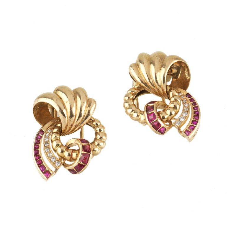 PAIR OF RUBY AND DIAMOND KNOT SHAPED CLIPS IN 18KT YELLOW GOLD