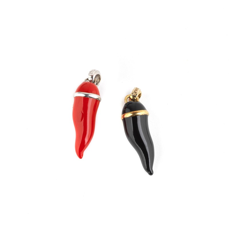 in smalto nero e rosso con passanti in oro giallo e bianco 18kt, dim. cm 1x3,5, gr. 10 complessivi