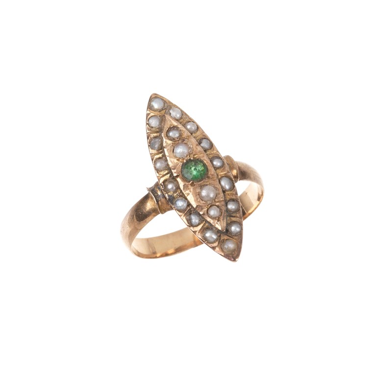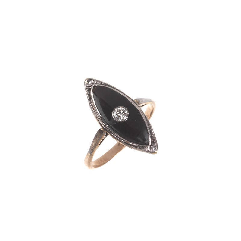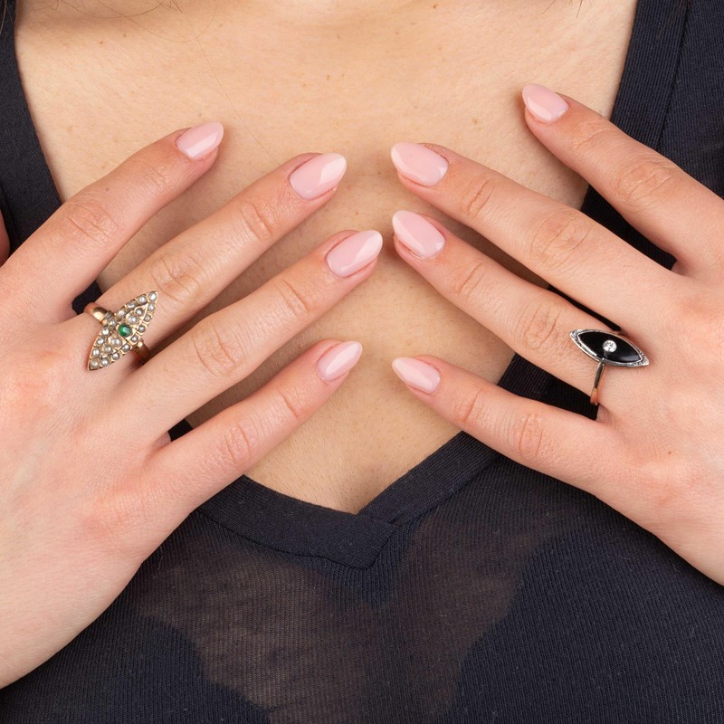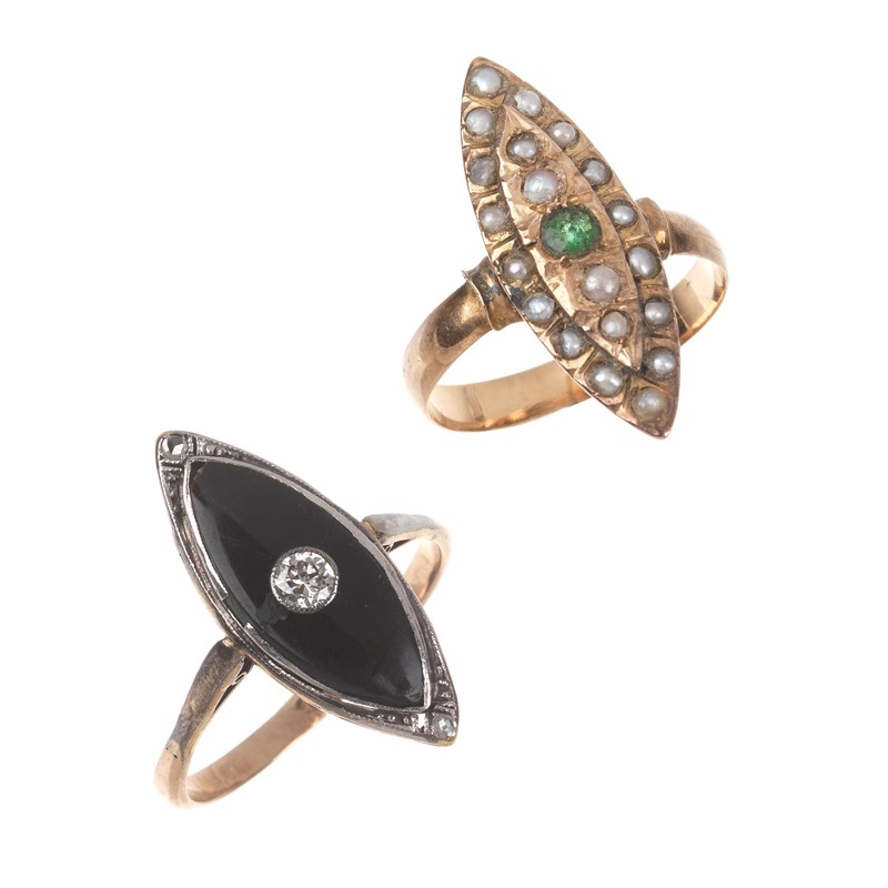 DUE ANELLI A LOSANGA di cui uno in oro a basso titolo, impreziosito da microperle e smeraldo centrale taglio rotondo, mis. 58, accompagnato da un secondo anello in oro e argento impreziosito da onice (difetti) e diamante taglio brillante di ct 0.10 circa, mis. 55, gr. 7