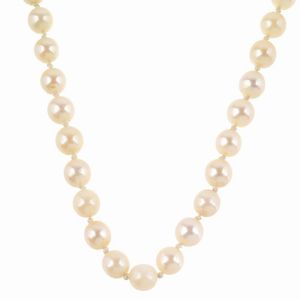 COLLANA DI PERLE ad un filo di perle di mm 6 circa, fermatura in oro giallo 18kt, punzone 750, lungh. cm 87, [..]