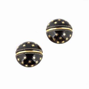 COPPIA DI BOTTONI in metallo dorato, dalla forma tondeggiante e raffigurante un motivo stellato, diam. cm 2 circa, [..]
