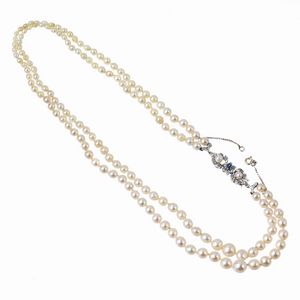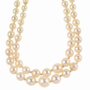 COLLANA DI PERLE a doppio filo di perle digradanti di mm 7-3 circa, fermatura in oro bianco 18kt con due perle [..]