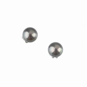 PAIO DI ORECCHINI CON PERLE in oro bianco 18kt, impreziositi da due perle grigie di mm 7 circa, chiusura a farfallina, [..]