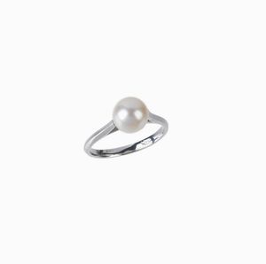 ANELLO CON PERLA in oro bianco 18kt, recante sulla sommità una perla di mm 8 circa, punzoni 750 e del fabbricante, [..]