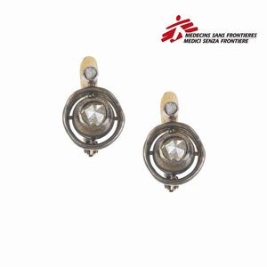PAIO DI ORECCHINI CON DIAMANTI in argento e oro, impreziositi da rose di diamante, dim. cm 1x1,5, chiusura a monachella, [..]