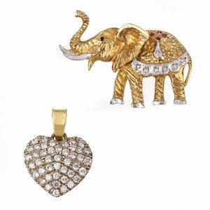 LOTTO COMPOSTO DA SPILLA E PENDENTE spilla in oro giallo e bianco 10kt, realizzata a forma di elefante, dim. cm [..]