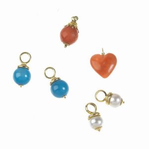 SEI CIONDOLI CON CORALLO E CALCEDONIO con passanti in oro giallo 18kt, di cui due con perle di mm 10 circa, dim. [..]