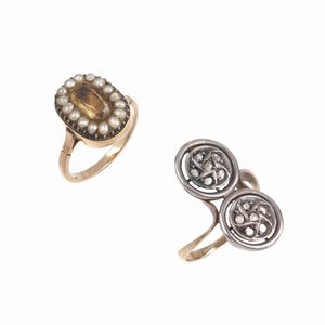 LOTTO COMPOSTO DA DUE ANELLI in oro e argento, di cui uno con quarzo centrale sfaccettato circondato da una fila [..]