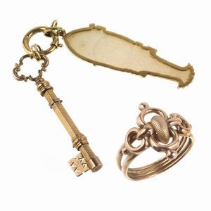 LOTTO COMPOSTO DA PORTACHIAVI E ANELLO portachiavi in oro 14kt, con due ciondoli di cui uno a forma di chiave [..]