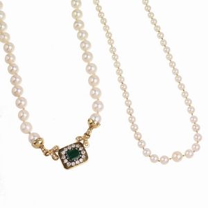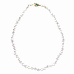 COLLANA DI PERLE CON SMERALDI ad un filo perle agglomerate digradanti di mm 7-5 circa, fermatura in oro bianco [..]