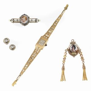 LOTTO COMPOSITO in oro a basso titolo e argento, composto da un paio di orecchini impreziositi da pietre incolore [..]