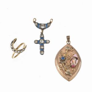 LOTTO COMPOSTO DA DUE PENDENTI E UN ANELLO di cui un pendente in oro a basso titolo decorato da tralci con una [..]