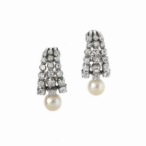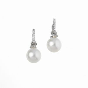 PAIO DI ORECCHINI CON PERLE PENDENTI E DIAMANTI in oro bianco 18kt, impreziositi da diamanti taglio brillante [..]