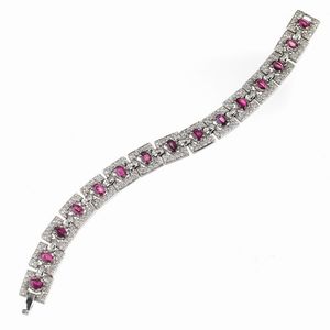 BRACCIALE A CATENA CON ZAFFIRI ROSA E DIAMANTI in oro bianco 18kt, composto da una serie di maglie quadrate concatenate [..]