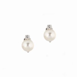 PAIO DI ORECCHINI CON PERLE E DIAMANTI in oro bianco 18kt, impreziositi da perle di mm 9 circa sormontate da diamanti [..]