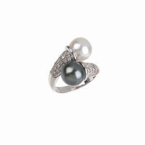ANELLO CONTRARIE CON PERLE E DIAMANTI in oro bianco 18kt, con agli apici una perla bianca e una grigia di mm [..]