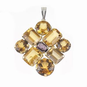 GRANDE PENDENTE CON QUARZI CITRINI E AMETISTA in argento, di forma romboidale, composto da grandi quarzi taglio [..]