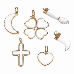 SEI GRANDI PENDENTI in oro giallo 18kt e materiale incolore, di varie forme e dimensioni, raffiguranti una croce, [..]