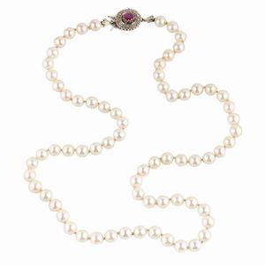 COLLANA DI PERLE CON RUBINO E DIAMANTI ad un filo di perle di mm 7 circa, fermatura in oro bianco 18kt impreziosita [..]