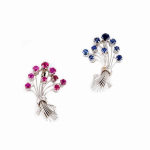 COPPIA DI SPILLE A MAZZO FIORITO CON ZAFFIRI E RUBINI in oro bianco 18kt, di cui una con zaffiri taglio rotondo [..]
