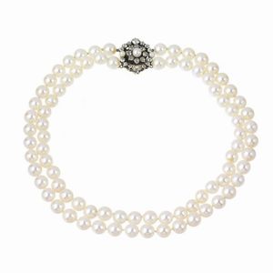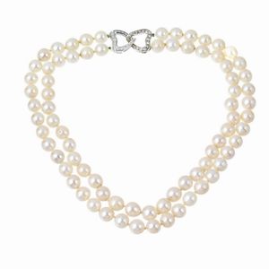COLLANA DI PERLE a doppio filo di perle di mm 9 circa, fermatura in oro bianco 18kt impreziosita da diamanti taglio [..]