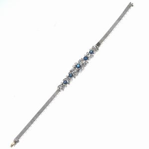 BRACCIALE A TRALCI CON ZAFFIRI E DIAMANTI in oro bianco 18kt, composto da una serie di maglie quadrate satinate, [..]