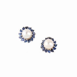 PAIO DI ORECCHINI FLOREALI CON PERLE E ZAFFIRI in oro bianco 18kt, impreziositi al centro da perle di mm 8 circa, [..]