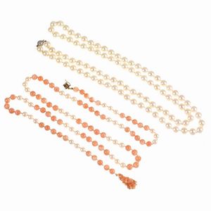 DUE LUNGHE COLLANE CON PERLE E CORALLI ROSA di cui una ad un filo di perle e boules in corallo rosa di mm 7 circa, [..]