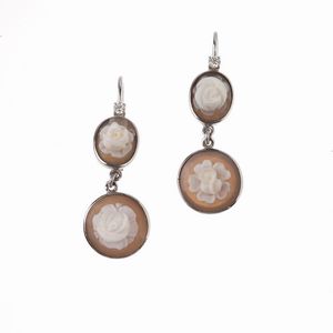 PAIO DI ORECCHINI PENDENTI CON CAMMEI in oro bianco 18kt, composti da due cammei ciascuno, raffiguranti delle [..]