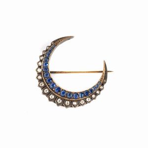 SPILLA A FORMA DI SEMILUNA CON ZAFFIRI E DIAMANTI in argento, impreziosita da una fila di zaffiri taglio rotondo [..]