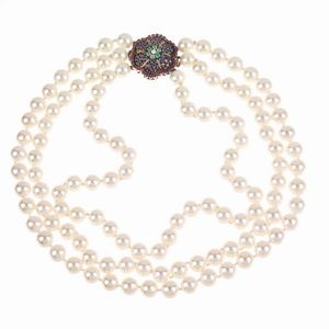 GIROCOLLO DI PERLE CON PIETRE DI COLORE a tre fili di perle di mm 8 circa, fermatura in oro giallo e bianco 18kt [..]