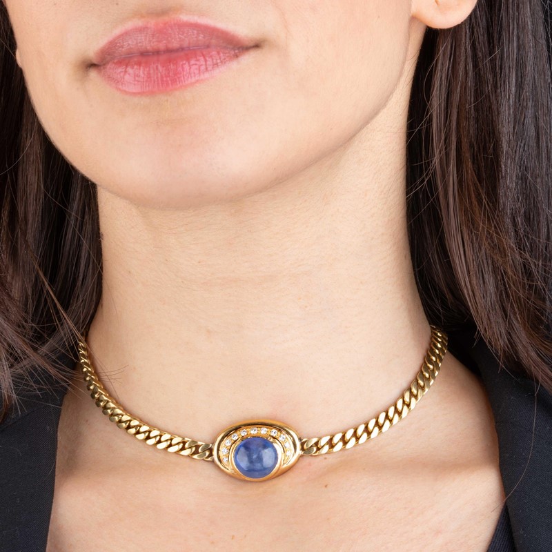 GIROCOLLO CON ZAFFIRO E DIAMANTI in oro giallo 18kt, realizzato a maglia groumette, con elemento centrale impreziosito da uno zaffiro taglio cabochon di ct 19 circa, circondato da diamanti taglio brillante per ct 0.40 circa, punzoni 750 e del fabbricante, lungh. cm 36, gr. 65