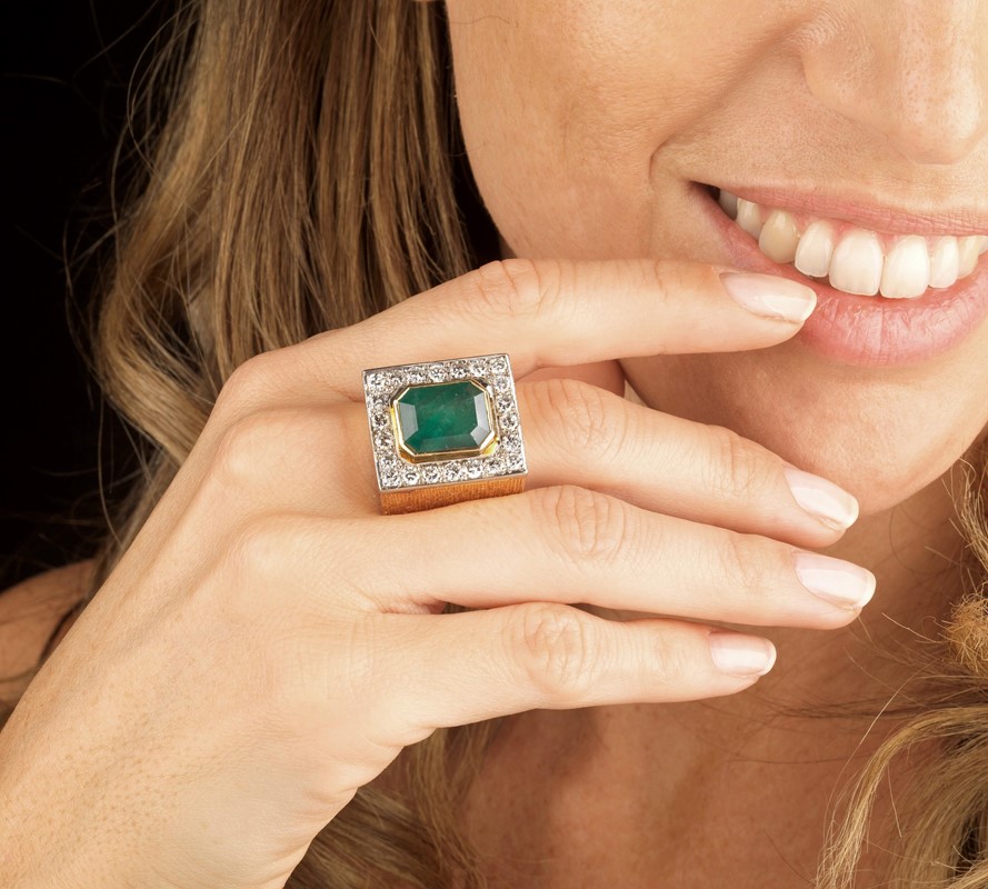 BIG BAND EMERALD AND DIAMOND RING IN 18KT TWO TONE GOLD