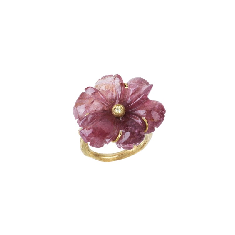 in oro giallo satinato 18kt, realizzato a forma di fiore con una grande tormalina incisa, recante al centro un diamante taglio brillante, mis. 57, gr. 16