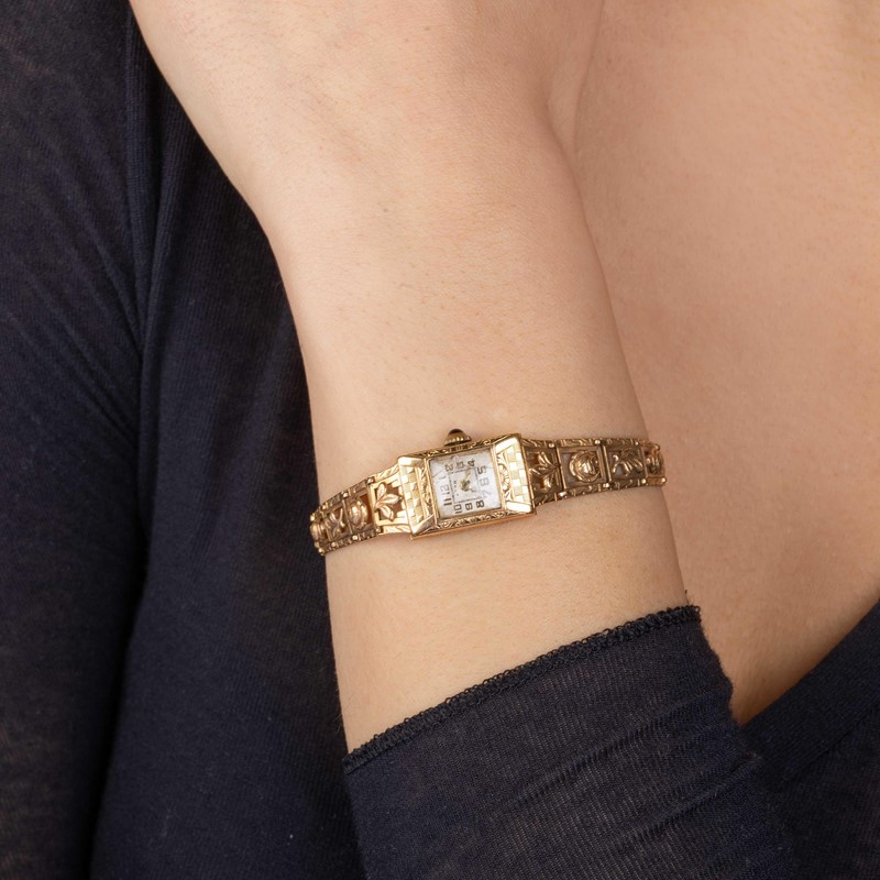 LOTTO COMPOSITO in oro a basso titolo e argento, composto da un paio di orecchini impreziositi da pietre incolore con chiusura a vite e due spille recanti decorazioni in smalto, accompagnati da un orologio da polso (difetti) di dim. mm 14x20, con quadrante bianco, indici applicati, movimento a carica manuale, lungh. cm 17, gr. 36 complessivi