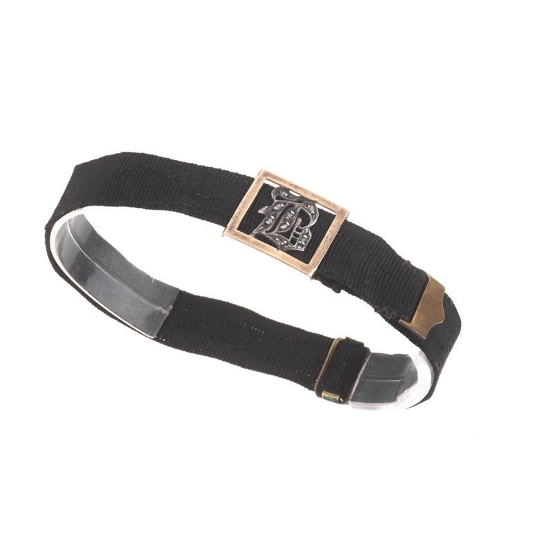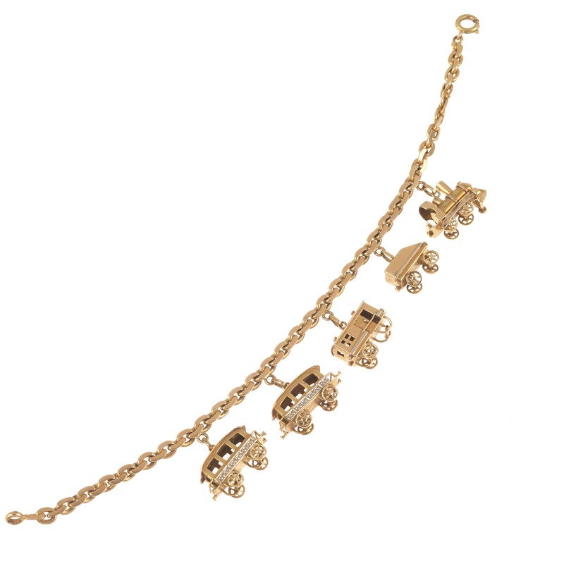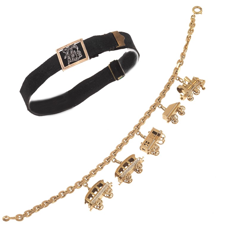 di cui uno in oro giallo e bianco 18kt, realizzato a catena, da cui pendono cinque ciondoli a forma di vagoni di un treno, punzone 750, lungh. cm 18,5, gr. 22, accompagnato da un bracciale in nastro nero, realizzato a cintura, con fibbia in oro 9kt e argento, gr. 2