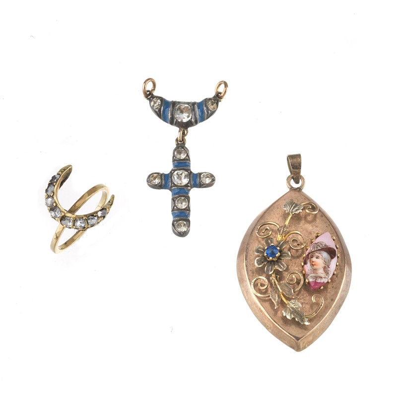 LOTTO COMPOSTO DA DUE PENDENTI E UN ANELLO di cui un pendente in oro a basso titolo decorato da tralci con una figurina in smalto e un secondo ciondolo a forma di croce in argento e oro a basso titolo, con pietre incolore, gr. 6 complessivi, accompagnati da un anello in oro giallo 18kt recante una mezzaluna impreziosita da rose di diamante, mis. 48, gr. 2
