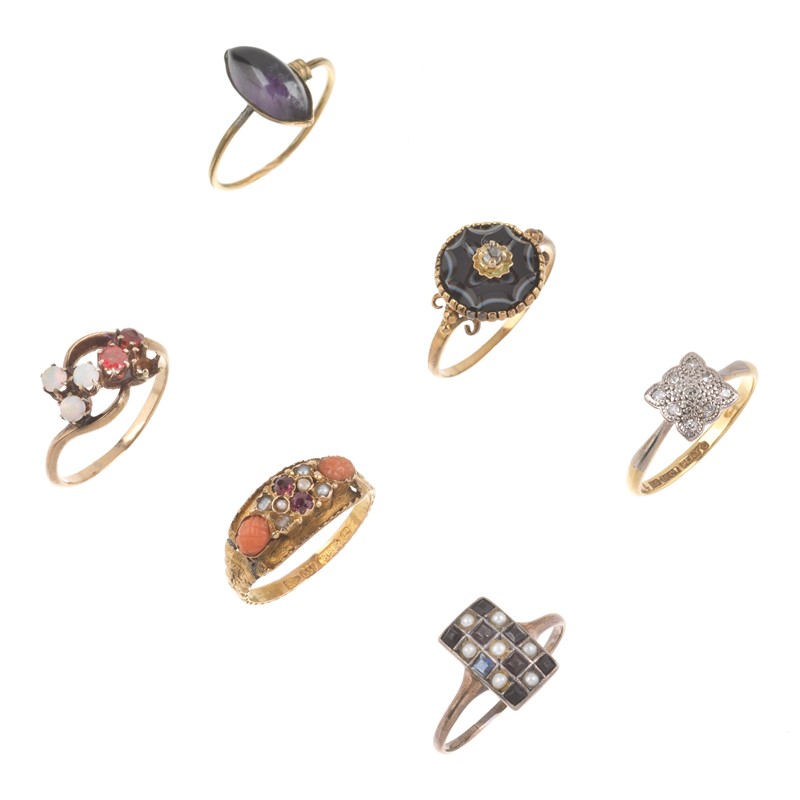 di cui cinque in oro a basso titolo e argento ed un anello in oro giallo 18kt e platino, impreziositi da pietre semipreziose e diamanti, punzoni dell'oro e del fabbricante, mis. 55, 56, 57, e 58, gr. 13 complessivi