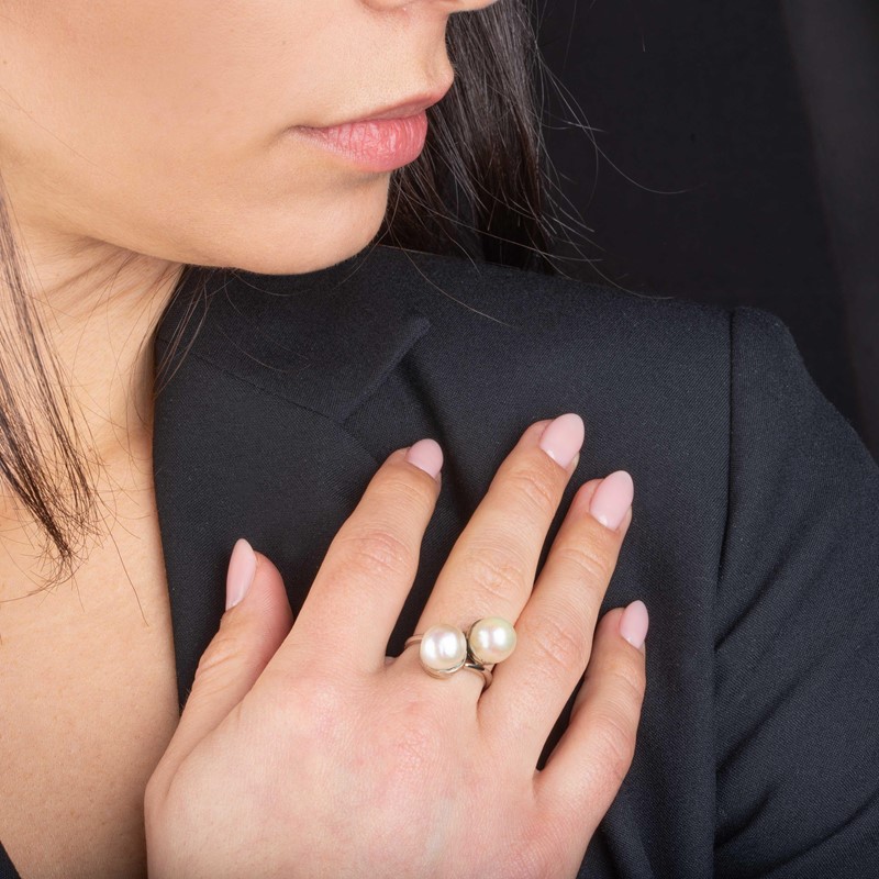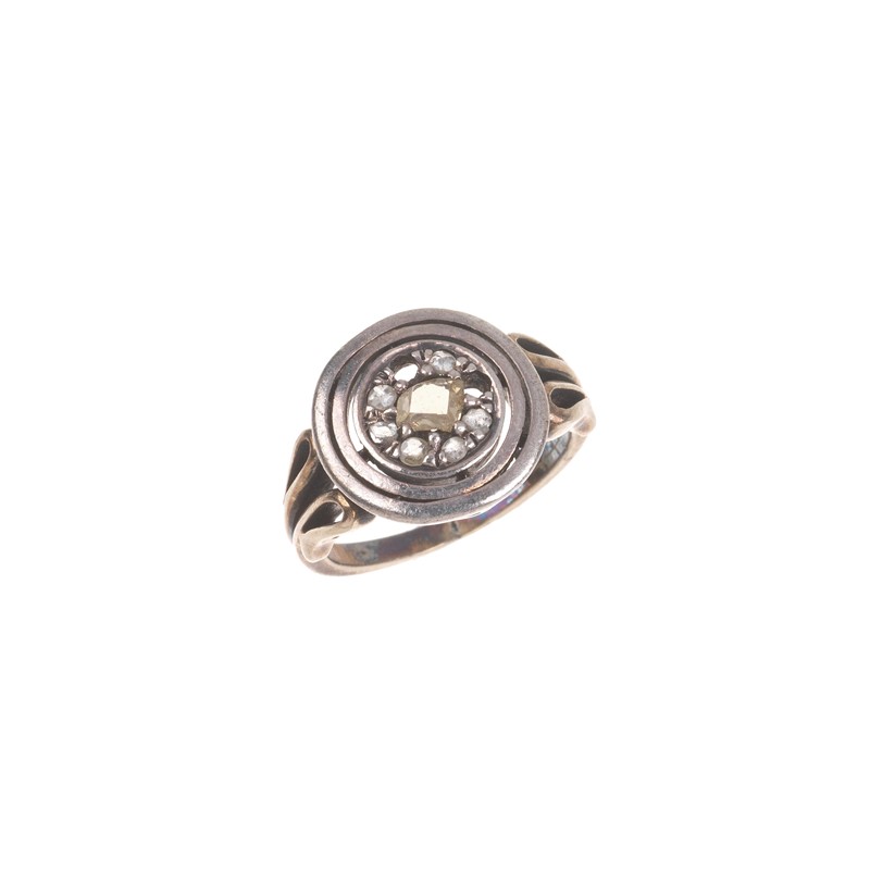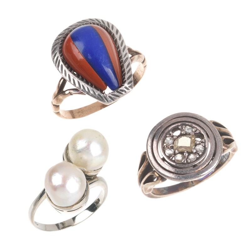LOTTO COMPOSTO DA TRE ANELLI di cui uno in oro bianco 18kt, con agli apici due perle di mm 9 circa, punzone 750, mis. 56, gr. 8, accompagnato da due anelli in oro e argento di cui uno impreziosito da rose di diamante e l'altro decorato con inserti in smalto, mis. 57 e 45, gr. 7 complessivi