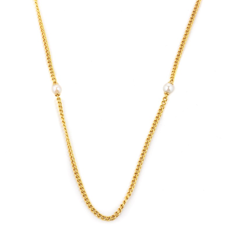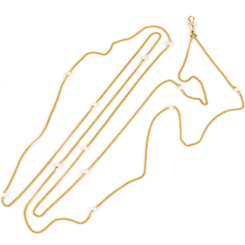 in oro giallo 18kt, realizzata a doppio filo con gancio a moschettone, impreziosita da piccole perle di mm 4 circa, lungh. cm 77, gr. 24