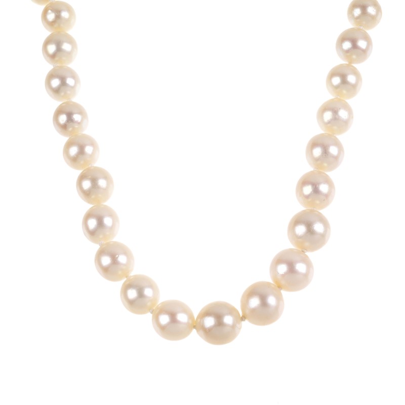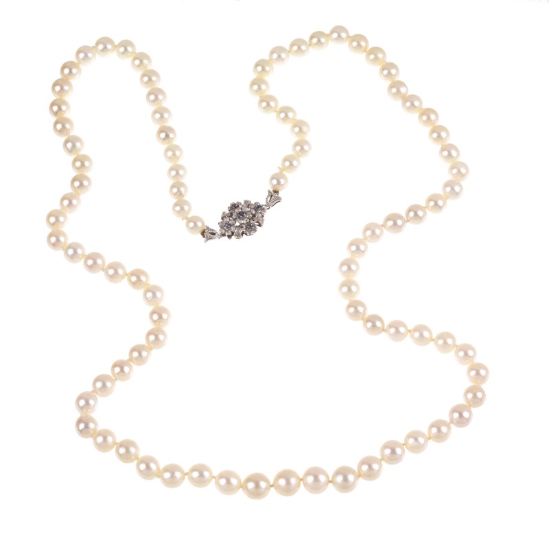 ad un filo di perle leggermente digradanti di mm 10-7 circa, fermatura in oro bianco satinato 18kt raffigurante un motivo floreale con piccoli zaffiri taglio rotondo, punzoni 750 e del fabbricante, lungh. cm 82, gr. 81