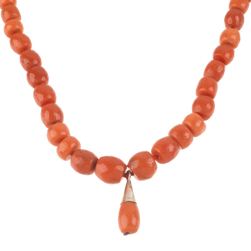 ad un filo di barilotti in corallo digradanti da mm 10x11 a mm 6x6 circa, con pendente a goccia in oro a basso titolo e corallo, fermatura a cilindro in oro giallo 18kt, lungh. cm 79, gr. 77