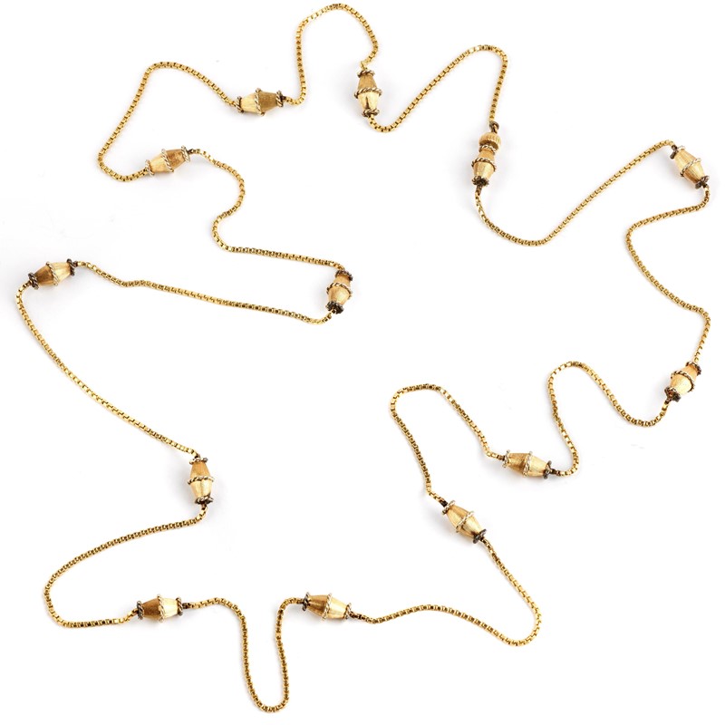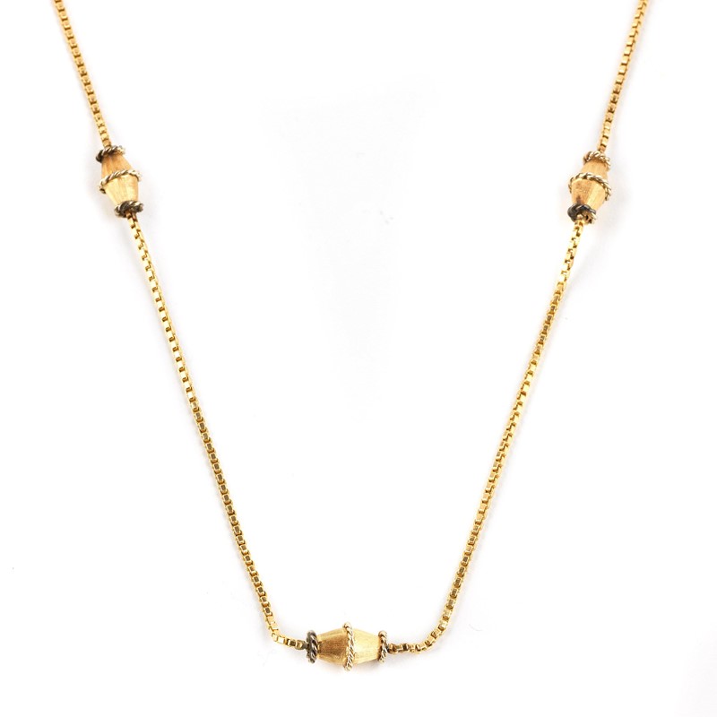 in oro giallo e bianco 18kt, realizzata a catena con distanziali satinati di forma trapezoidale, chiusura a vite, lungh. cm 119, gr. 36