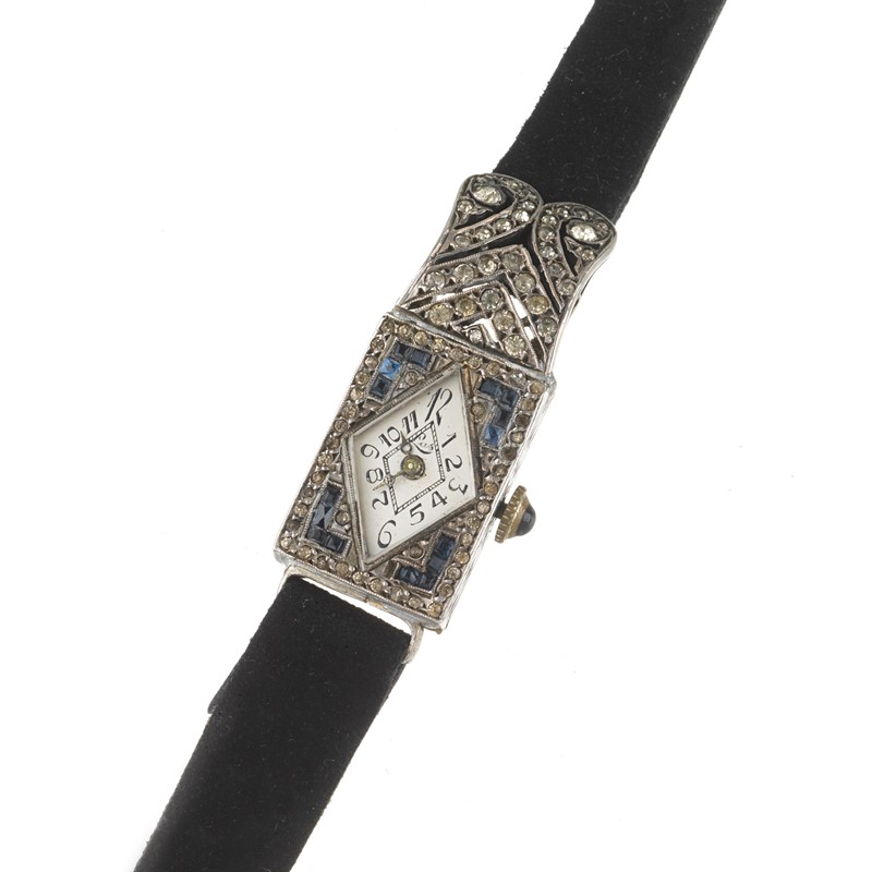 cassa in platino impreziosita da pietre incolore e zaffiri taglio fantasia, quadrante bianco di forma romboidale, firmato "Las", con numeri arabi, movimento a carica manuale, bracciale in tessuto con fibbia in oro. Dim. mm 15x20.
