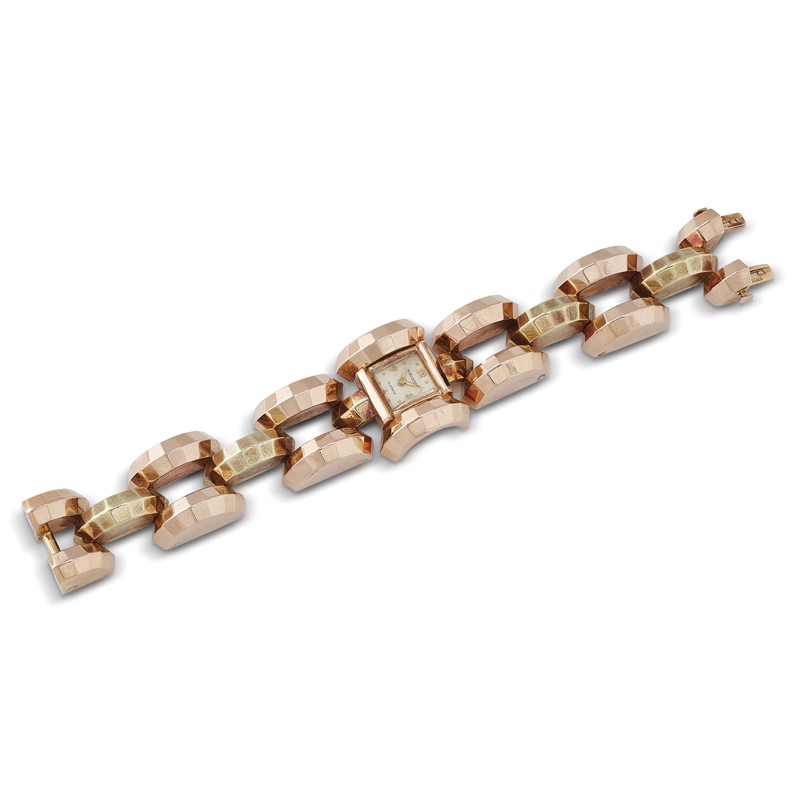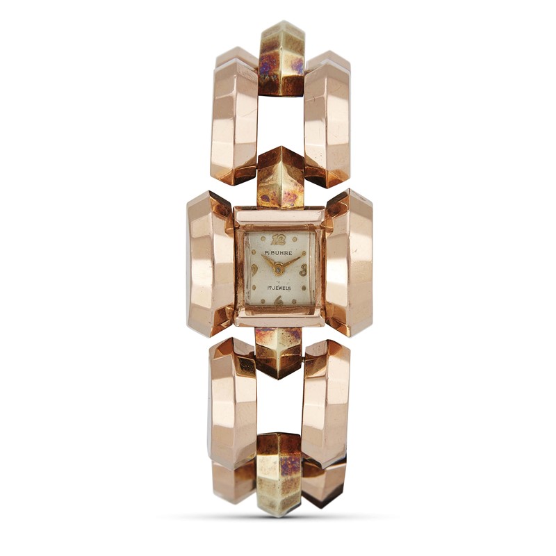 P.BUHRE OROLOGIO DA DONNA cassa in oro giallo e rosa 14kt, quadrante argentè firmato "P.Buhre", indici applicati, movimento a carica manuale, bracciale integrato composto da grandi maglie in oro giallo e rosa 14kt con firma "Sparkes", punzone 14kt, lungh. cm 17,5, gr. 63. Dim. mm 28x18.