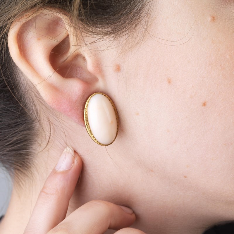 in oro giallo e bianco 18kt, di forma ovale, impreziositi da coralli rosa taglio cabochon, chiusura a clip, punzoni 750 e del fabbricante, dim. cm 1,5x2,5, gr. 17 complessivi