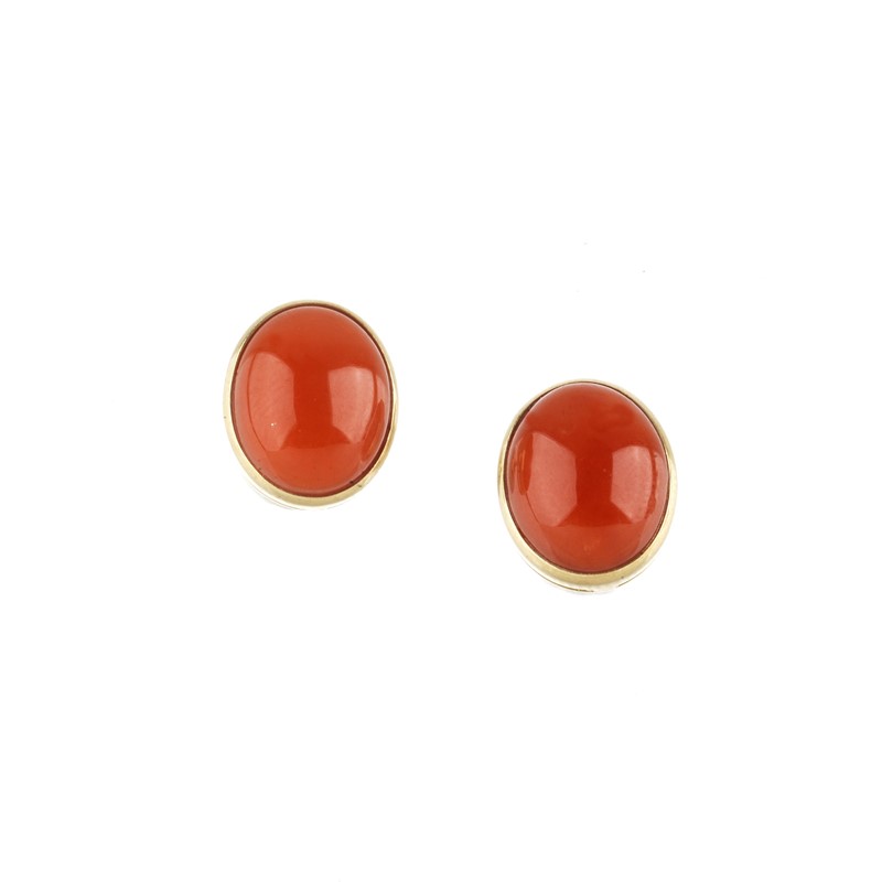 in oro giallo 18kt, impreziositi boules in corallo taglio cabochon di mm 13x11x6 circa, dim. cm 1x1,5 circa, chiusura a farfallina, punzoni 750 e del fabbricante, gr. 7 complessivi