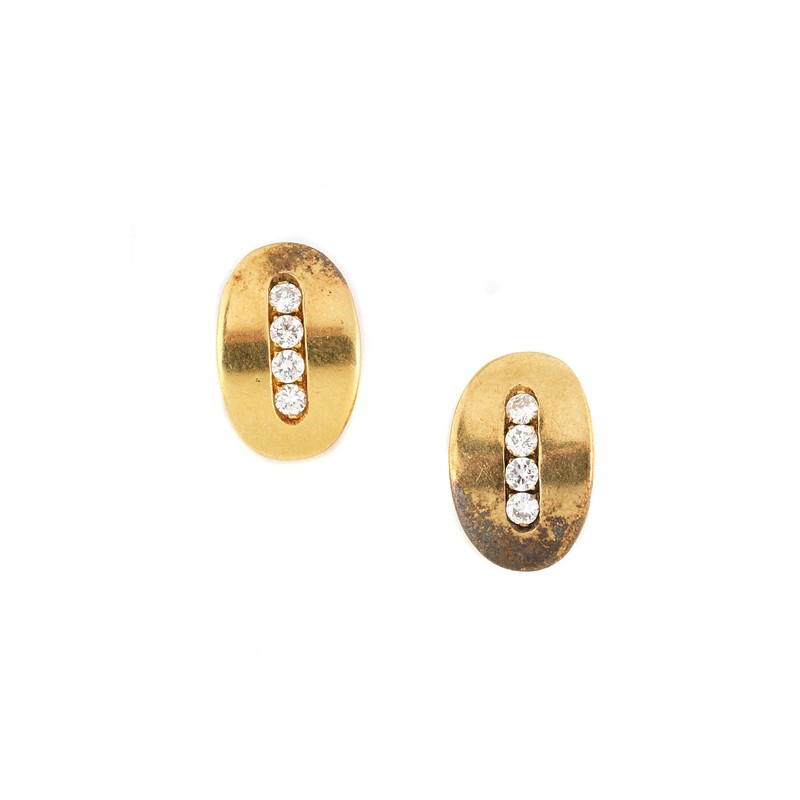 in oro giallo e bianco 18kt, impreziositi al centro da file di diamanti taglio brillante per ct 0.40 circa, dim. cm 1x1,5, chiusura a clip, gr. 8 complessivi