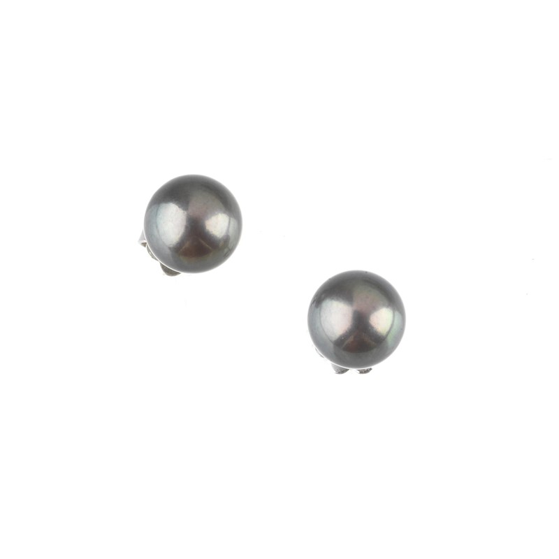 in oro bianco 18kt, impreziositi da due perle grigie di mm 7 circa, chiusura a farfallina, punzoni 750 e del fabbricante, gr. 2 complessivi